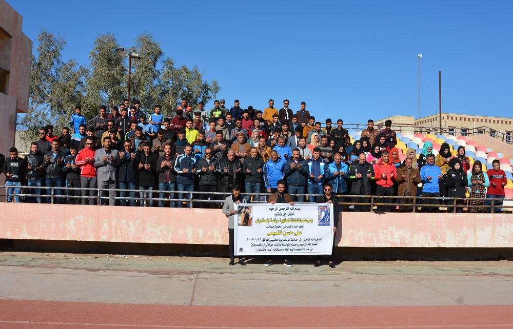 قسم النشاطات الطلابية برئاسة جامعة ديالى ينظم وقفة حداد وقرآءة سورة الفاتحة على روح ابنها البار والرياضي الخلوق الطالب (علي حسن التميمي) الذي وافاه الاجل أثر حادث مؤسف يوم الخميس الموافق (26-1-2017). وذلك بحضور السيد مدير القسم (أ.م.د عادل عباس ذياب) والسيد عميد كلية التربية البدنية وعلوم الرياضة (أ.م.د ليث ابراهيم جاسم) والموظفين والطلبة. سائلين المولى عز وجل ان يتغمد المرحوم برحمته الواسعة وينزله مع الابرار والصديقين في جنات النعيم وألهم اهله الصبر والسلوان.